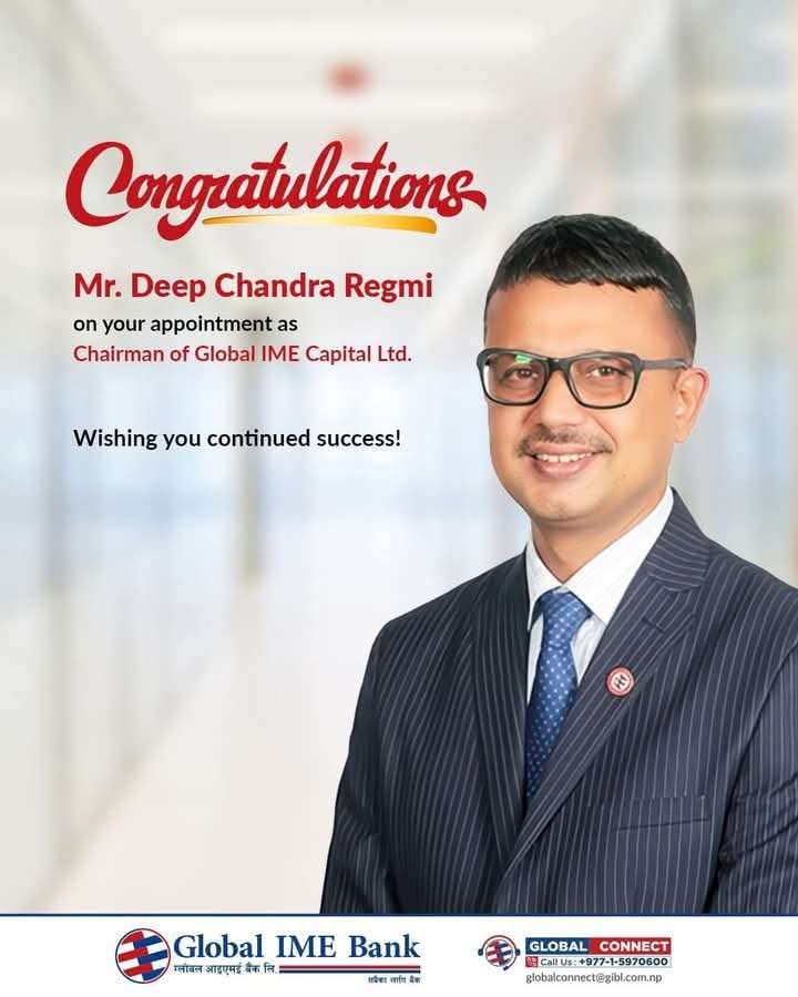 काठमाडौं। ग्लोबल आइएमई क्यापिटल लिमिटेडको अध्यक्षमा दिपचन्द्र रेग्मी भएका छन्। क्यापिटलको सञ्चालक समितिको बैठकले सञ्चालकको अध्यक्षमा हाल क्यापिटलकै सञ्चालक रहेका रेग्मीलाई अध्यक्ष पदमा चयन गर्ने निर्णय गरेको हो।