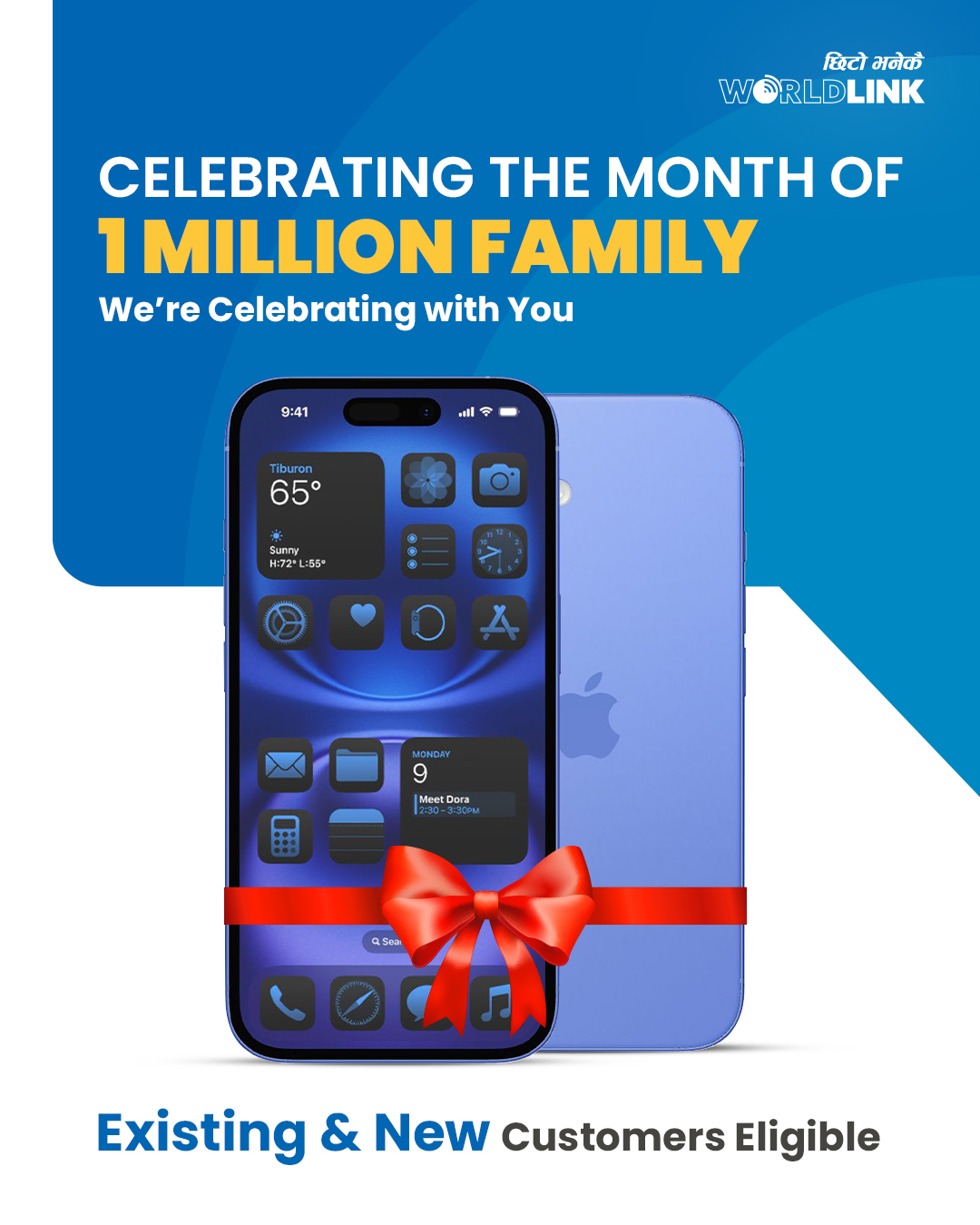 काठमाडौं । दुरसञ्चार क्षेत्रको अग्रणी संस्था वर्ल्डलिंक कम्युनिकेशन्सले नयाँ ग्राहक एवं सेवा नविकरण गर्दा १० भाग्यशाली विजेतालाई आईफोन १६ उपहार दिने घोषणा गरेको छ । आफ्ना ग्राहक घरधुरी संख्या १० लाख पुग्न लागेको अवसरमा वर्ल्डलिंक कम्युनिकेशन्सले नयाँ सेवा एवं नविकरण गर्दा भाग्यशाली १ जनालाई हरेक दिन आईफोन १६ उपहार दिने घोषणा गरेको हो ।