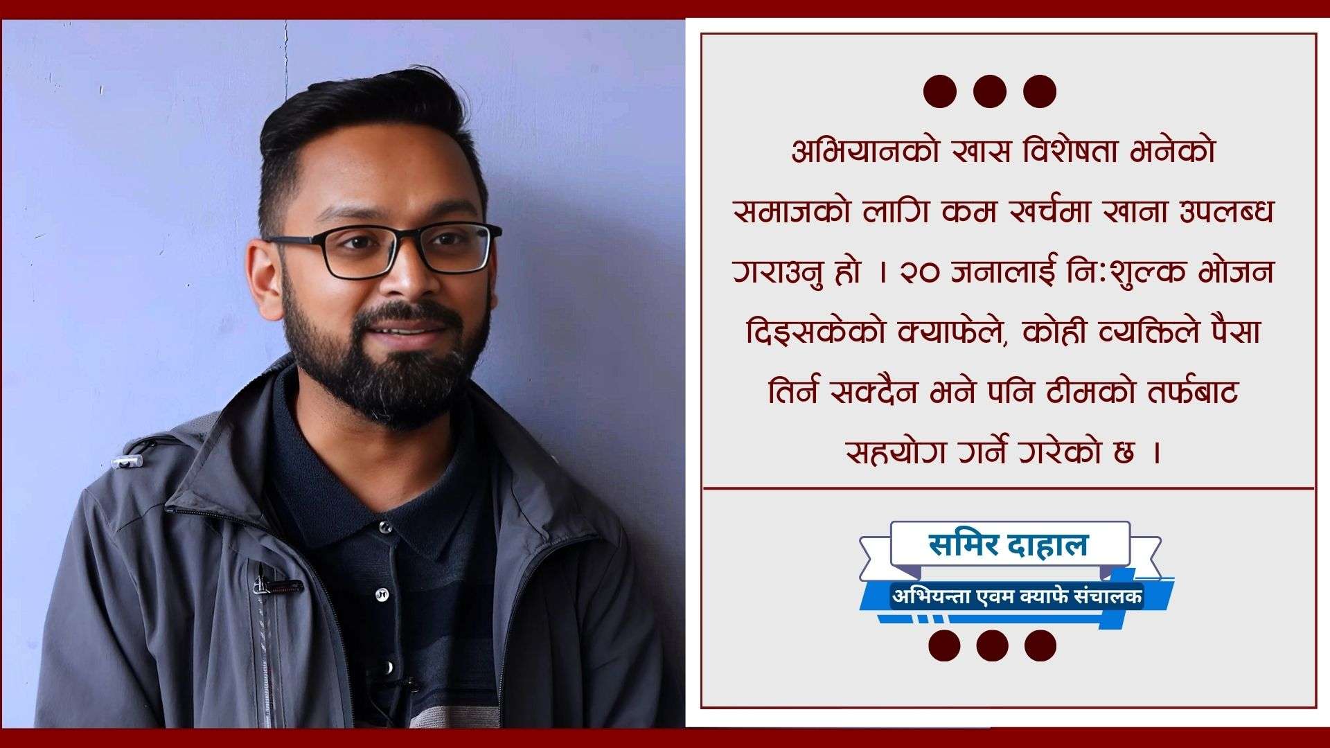समिरको यस अभियानको खास विशेषता भनेको समाजको लागि कम खर्चमा खाना उपलब्ध गराउनु हो । २० जनालाई निःशुल्क भोजन दिइसकेको क्याफेले, कोही व्यक्तिले पैसा तिर्न सक्दैन भने पनि टीमको तर्फबाट सहयोग गर्ने गर्छन् ।