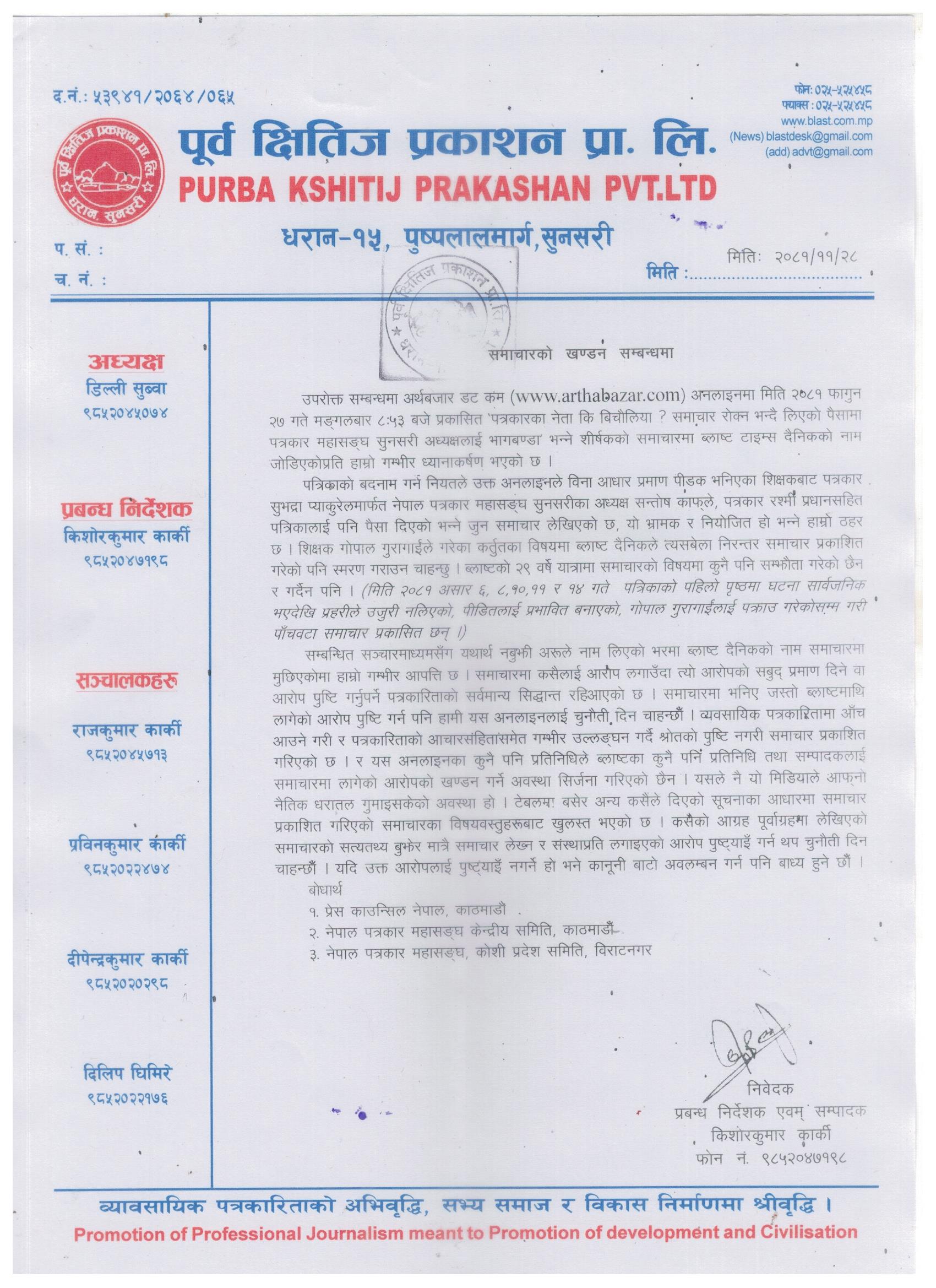 मिति २०८१ फागुन २७ गते मङ्गलबार ‘पत्रकारका नेता कि बिचौलिया ? समाचार रोक्न भन्दै लिएको पैसामा पत्रकार महासङ्घ सुनसरी अध्यक्षलाई भागबण्डा’ शीर्षकको समाचारमा ब्लाष्ट टाइम्स दैनिकको नाम जोडिएकोप्रति गम्भीर ध्यानाकर्षण भएको जनाएको हो ।