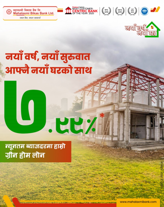 काठमाडौं । महालक्ष्मी विकास बैंकले नयाँ वर्ष २०८२ को अवसरमा ग्राहकहरुलाई लक्षित गरी महालक्ष्मी घर कर्जा एकल अंकको ब्याजदर ७.९९ प्रतिशतमा नै प्रदान गर्ने भएको छ ।