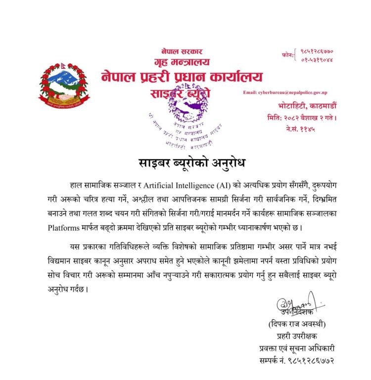 काठमाडौं । नेपाल प्रहरीको साइबर ब्युरोले एआईको प्रयोग सकारात्मक कार्यका लागि मात्रै गर्न आग्रह गरेको छ। साइबर ब्युरोले एक प्रेस विज्ञप्ति जारी गर्दै यस्तो आग्रह गरेको हो।