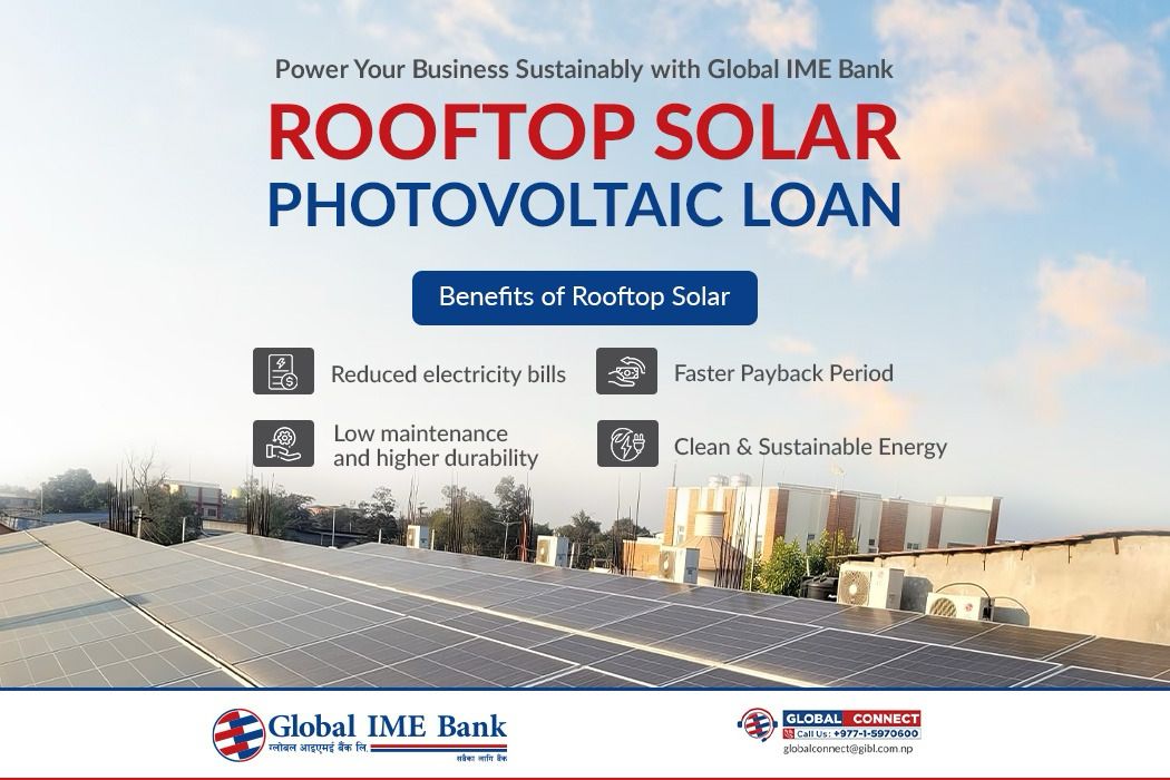 ग्लोबल आइएमई बैंक लिमिटेडले पृथ्वी दिवसको अवसरमा औद्योगिक र व्यावसायिक भवनमा सोलार सिस्टम जडानलाई प्रोत्साहन गर्न रुफटप सोलार कर्जा योजना सार्वजनिक गरेको छ ।