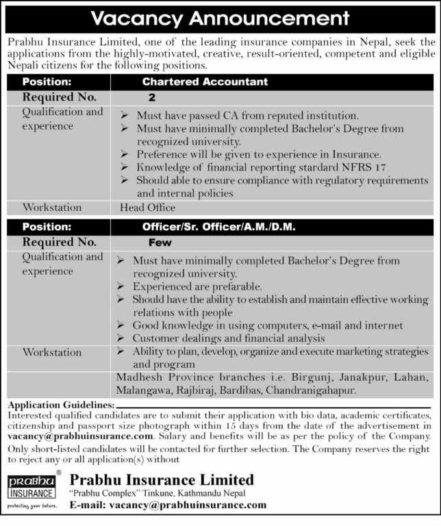 काठमाडौं । प्रभु इन्स्योरेन्स लिमिटेडले विभिन्न पदका लागि कर्मचारी माग गरेको छ। कम्पनीले चार्टर्ड एकाउन्टेन्टका लागि दुई जना र अफिसर सिनियर अफिसर एएम डीएमका लागि दकर्मचारी माग गरेको हो ।