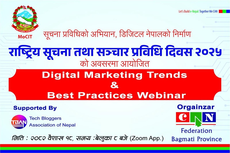 “Digital Marketing Trends & Best Practices” शीर्षकको यो वेबिनार २०७८ वैशाख १८ गते बेलुका ८ बजे जुममार्फत सञ्चालन हुनेछ। यस कार्यक्रमको मुख्य उद्देश्य व्यवसायी, बजार विज्ञ र सूचना तथा सञ्चार प्रविधि (आईसीटी) क्षेत्रका पेशेवरहरूलाई डिजिटल मार्केटिङका पछिल्ला प्रचलन र प्रभावकारी रणनीतिहरूबारे जानकारी गराउनु हो।