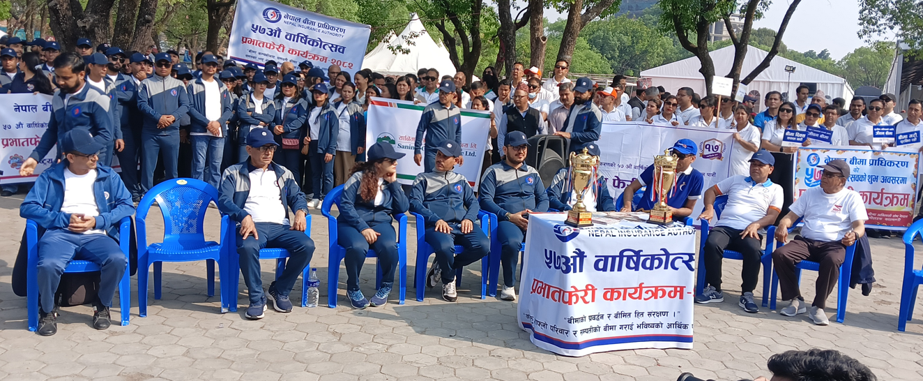 काठमाडौं । नेपाल बीमा प्राधिकरणको ५७औं वार्षिकोत्सवका अवसरमा आज विहान काठमाडौंमा प्रभातफेरी कार्यक्रम आयोजना गरिएको छ । प्राधिकरणद्वारा आयोजित प्रभातफेरी ¥याली बीमा सम्बन्धी विभिन्न जानकारीमूलक सन्देशहरू अङ्कित प्लेकार्ड तथा ब्यानरहरू प्रदर्शन गर्दै भद्रकालीदेखि सुन्धारा, एनएसी, रत्नपार्क हुँदै भृकृटीमण्डपमा पुगेर सभामा परिणत भएको थियो ।
