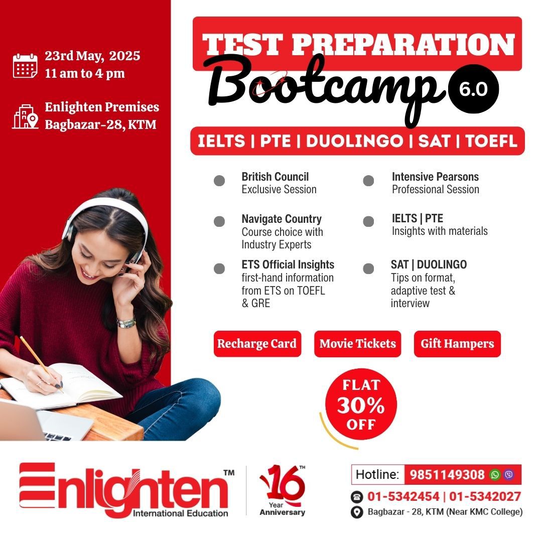‘हामीले विदेश जान चाहने विद्यार्थीहरूलाई सही टेस्ट र कोर्स चयनमा सहजीकरण गर्छौं,’ इन्लाइटनका एक प्रतिनिधिले भने, ‘बुटक्याम्प हाम्रो सेवालाई अझ नजिकबाट अनुभूत गराउने प्रयास हो।’