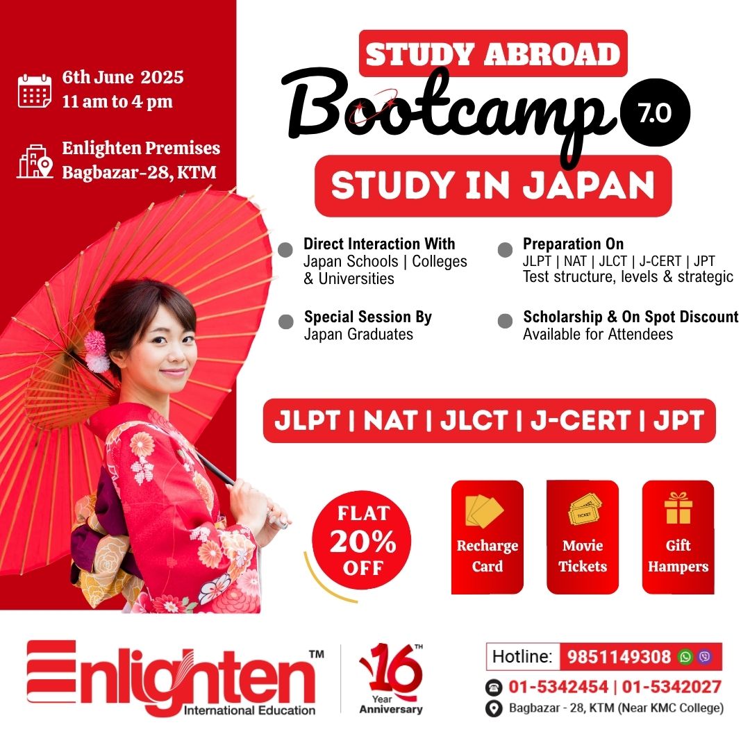 काठमाडौं । शैक्षिक परामर्श संस्था इन्लाइटन इन्टरनेसनल एजुकेशनले जापानमा उच्च शिक्षा हासिल गर्न चाहने विद्यार्थीहरूका लागि ‘जापान बुटक्याम्प ७.०’ आयोजना गर्ने भएको छ। कार्यक्रम जेठ २३ गते काठमाडौंको बागबजारस्थित इन्लाइटन परिसरमा बिहान ११ बजेदेखि दिउँसो ४ बजेसम्म सञ्चालन हुनेछ।