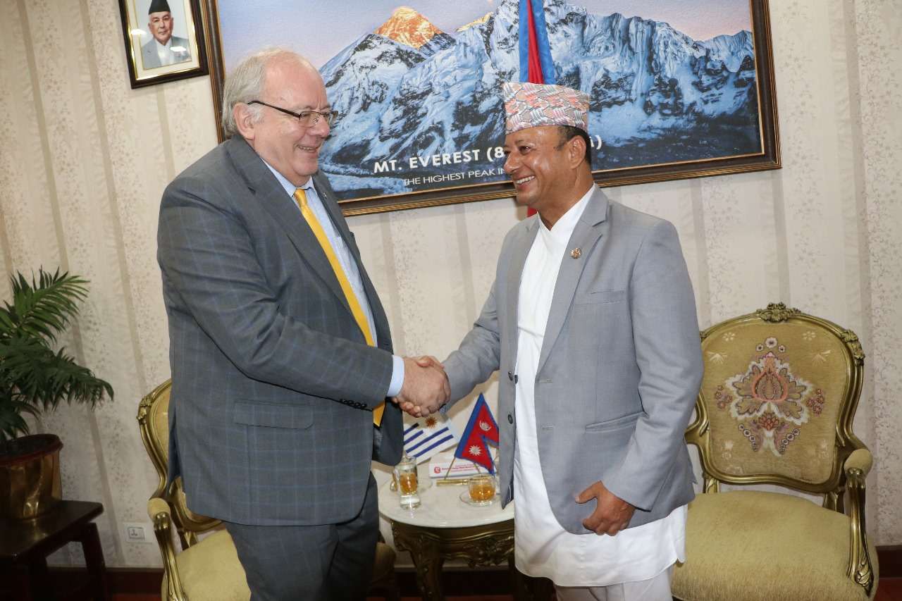काठमाडौं । ऊर्जा, जलस्रोत तथा सिँचाइमन्त्री दीपक खड्कासँग नेपालका लागि उरुग्वेका गैरआवासीय राजदूत अल्बर्टो ए गुआनीले शिष्टाचार भेट गरेका छन् । सिंहदरबारस्थित ऊर्जा मन्त्रालयमा आज भएको भेटमा दुई देशबीचको ऊर्जा र सिँचाइ क्षेत्रको सहकार्यका विविध विषयमा छलफल भएको थियो।