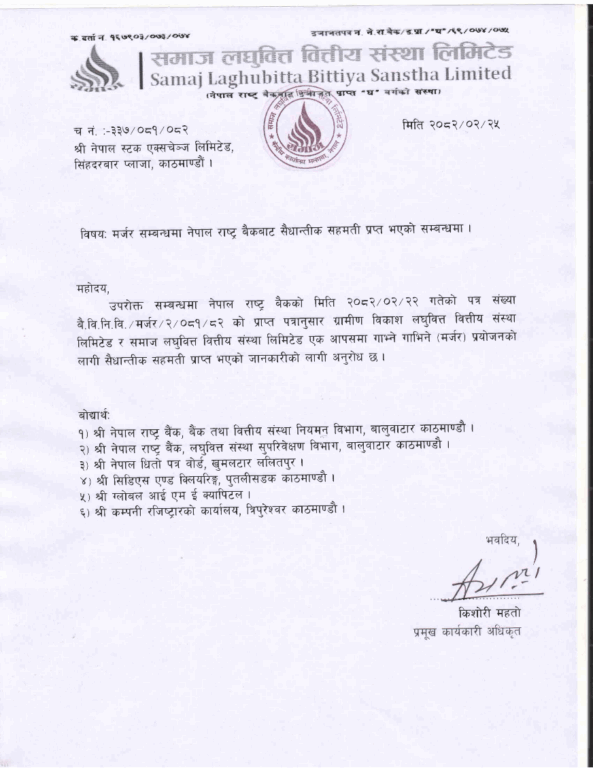 यसअघि समाज लघुवित्त र ग्रामीण विकास लघुवित्तले मर्जरको प्रारम्भिक सहमति फागुन महिनामै गरिसकेका थिए । अब राष्ट्र बैंकको स्वीकृति पश्चात दुबै संस्थाले मर्जर प्रक्रियालाई औपचारिक रूपमा अघि बढाउनेछन् ।