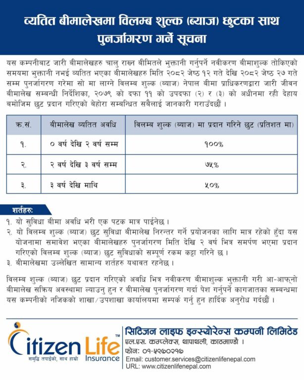 यस छुट बीमा अवधिभरी एक पटक मात्र पाइने कम्पनीले जनाएको छ । सो अवधिसम्ममा नविकरण शुल्क भुक्तानी गरी आफ्नो आफ्नो बीमालेख सक्रिय अवस्थामा ल्याउन तथा थप जानकारीको लागि कम्पनीको शाखा उपशाखा तथा अभिकर्ताहरुसँग सम्पर्क गर्न आग्रह गरेको छ ।