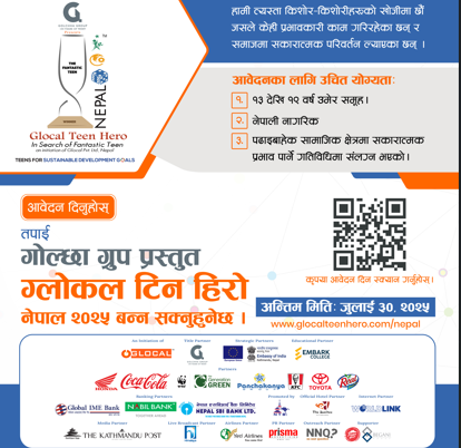 काठमाडौँ । गोल्छा ग्रुपद्वारा प्रस्तुत ग्लोकल टीन हिरो नेपाल २०२५ को ११ औं संस्करणका लागि आवेदन खुल्ला गरिएको छ। यो प्रतिष्ठित कार्यक्रमले नेपालका किशोरकिशोरीहरूलाई उनीहरूको असाधारण योगदान र नेतृत्वका लागि सम्मान गर्ने लक्ष्य राखेको छ ।