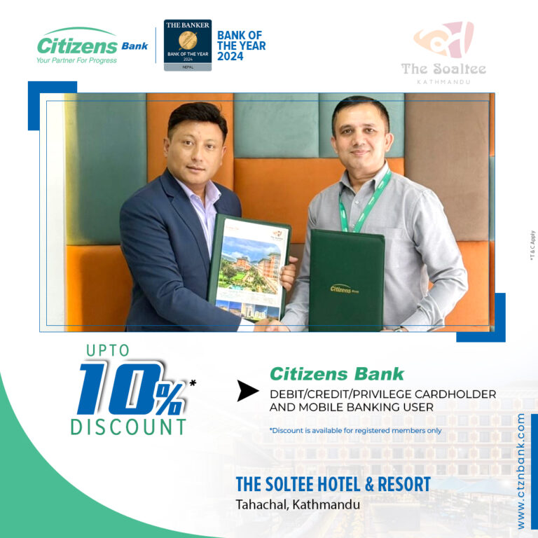 काठमाडौं । सिटिजन्स बैंक इन्टरनेसनल लिमिटेड र काठमाडौं स्थित द सोल्टी होटल एण्ड रिर्सोटबीच सिटिजन्स बैंकका ग्राहकहरूलाई विशेष छुट दिने समझदारी पत्रमा हस्ताक्षर भएको छ ।