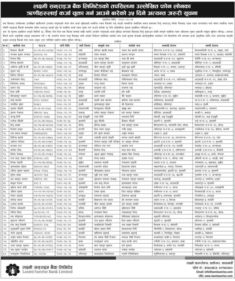काठमाडौं । लक्ष्मी सनराइज बैंकले कर्जाको किस्ता समयमा तिर्न नसकेका ५० जना ऋणीहरूको विवरण सार्वजनिक गरेको छ ।बैंकले आफ्ना ग्राहकहरूको आवश्यकतालाई ध्यानमा राख्दै ‘फोनलोन’ सेवा सुरु गरेको छ ।