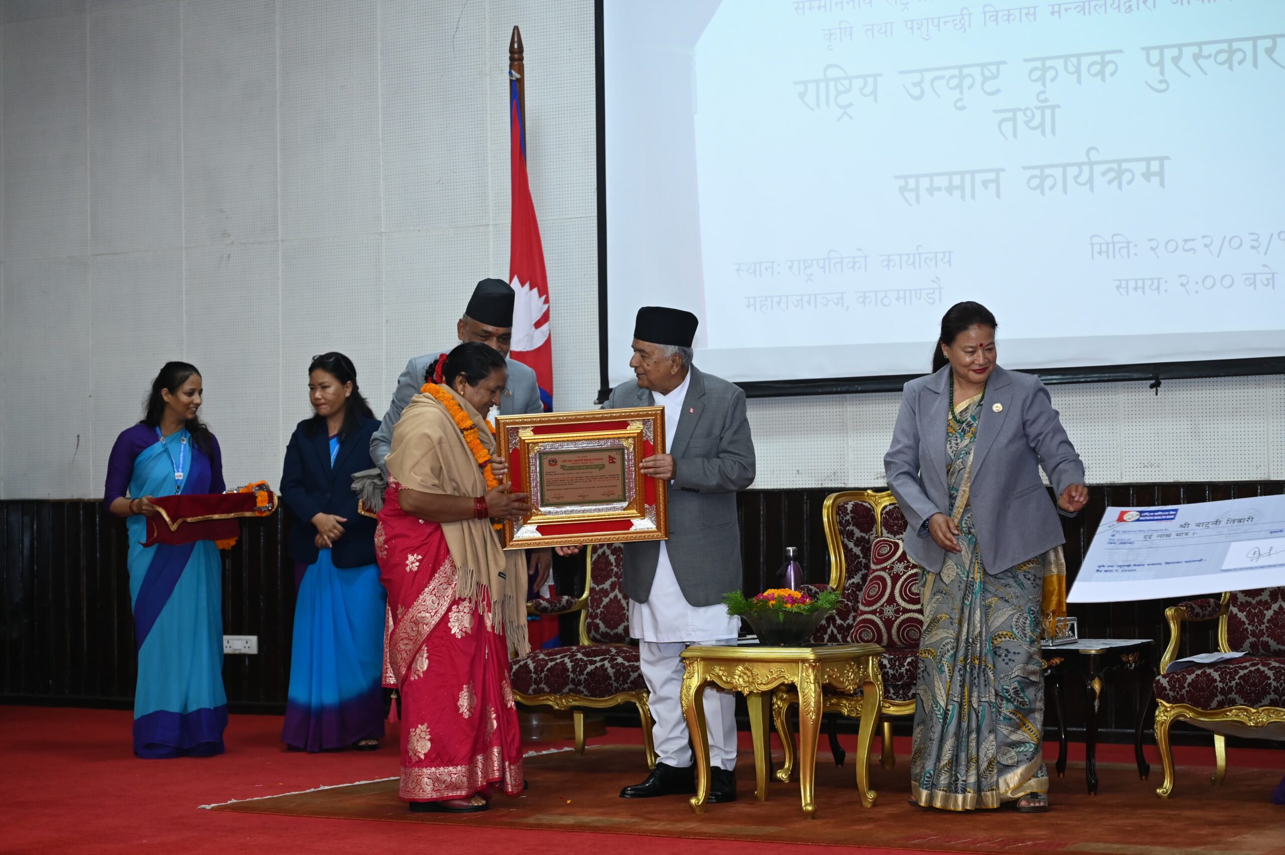 सो अवसरमा राष्ट्रपति पौडेलले कोशी प्रदेशबाट आर्य कृषि फर्मका सुरेश कुमार मेहता, कोशी प्रदेशकै रमेश कृषि फर्मका रमेश साह, मधेश प्रदेशबाट शम्भुनाथ माछा फार्मका भरत कुमार यादव, मधेश प्रदेशबाट निजगढ केरा एग्रिकल्चर फार्मका हिरा बहादुर थापा मगर, बागमतिबाट कालिका पशु विकास केन्द्रका चेत प्रसाद ढकाल, बागमतिबाटै ग्रिनलाइन एग्रो प्रालिका दयाराम मचामसी, गण्डकीबाट ङवाङहिसी कृषि तथा पशुपन्छी अर्गानिक फर्मका छिरिङ गुरुङ, गण्डकीबाटै मित्र बाटिका कृषि फर्मका बाटुली तिवारी, लुम्बीनीबाट जयपाल मौर्य, लुम्बिनीबाट शान्ति उन्नत पशुपालन तथा माछा फर्म प्रालिका सुवास कुर्मी, कर्णालीबाट गोविन्द ओली र भरतनाथ योगी, सुदुरपश्चिमबाट खप्तड पशुपन्छी तथा कृषि फर्मका प्रेम प्रसाद जोशी र कैलाशेधरी कृषि तथा पोल्ट्री फर्म प्रालिका लोकबहादुर थापालाई सम्मान गरेका थिए ।