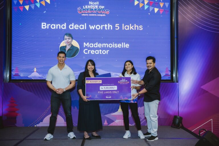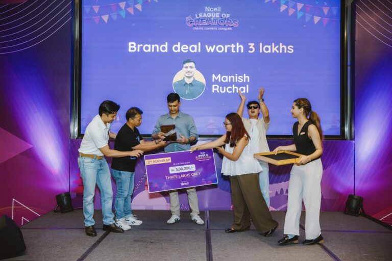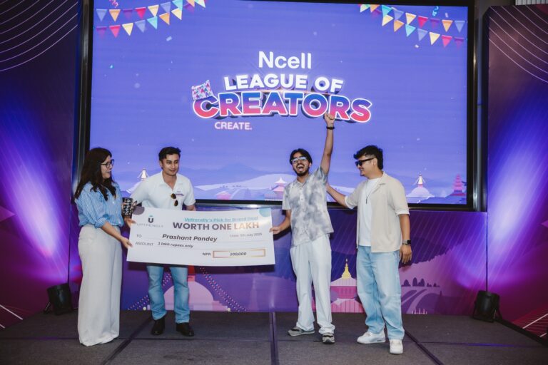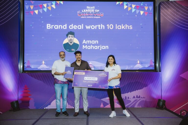 काठमाडौं । एनसेलले अपट्रेन्डलीसँगको सहकार्यमा आयोजना गरेको ‘लीग अफ क्रिएटर्स’ प्रतियोगितामा ललितपुरका अमन महर्जनले १० लाख रुपैयाँबराबरको एक वर्षको ब्रान्ड डिल जित्ने सफल भएका छन् । उनले प्रतियोगितामा प्रथम स्थान हाषिल गर्दै पुरस्कार स्वरुप यो डिल हात पारेका हुन् ।