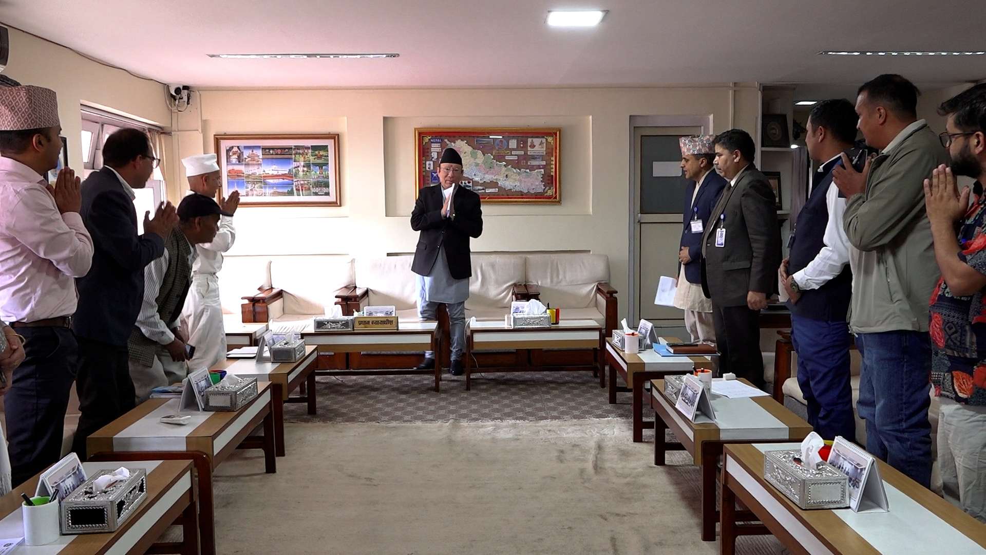 काठमाडौँं । दिक्त्तेल रुपाकोट मझुवागढी नगरपालिका खोटाङका नगरप्रमुख तीर्थराज भट्टराइले प्रधानन्यायधीश प्रकाशमान सिहं रावतलाई बाँसबाट तयार गरिएका सामग्रीहरु हस्तान्तरण गरेका छन् । बाँसलगायतका स्थानीय सामग्रीको उपयोग गर्न नीति निर्माण र कार्यान्वयनका लागि नेपाल सरकारलाई निर्देशन दिनुपर्ने माग राख्दै शुक्रबार प्रधानन्यायधीशकै कार्यकक्षमा पुगेर बाँसका सामग्री हस्तान्तरण गरेका हुन् । सामग्रीमा कुर्सी र टेबल समावेश छन् ।