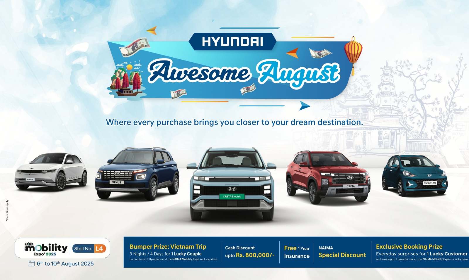 काठमाडौं । नेपालमा हुन्डाई गाडीको आधिकारिक वितरक लक्ष्मी इन्टरकन्टिनेन्टल प्रा. लि. ले “हुन्डाई अचम्मको अगष्ट” योजना सुरु गरेको छ। यो योजना साउन २१ देखि २५ गतेसम्म काठमाडौंको भृकुटीमण्डपमा आयोजना भएको नाइमा मोबिलिटी एक्स्पो २०८२ को अवसरमा सञ्चालन हुँदैछ। हुन्डाईको स्टल नम्बर एल ४ रहेको छ।