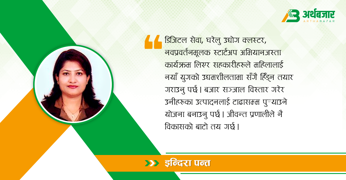 आज हामी ‘सक्षम महिला, सक्षम संस्था’ भन्ने नारालाई व्यवहारमा उतार्ने प्रयास गर्दै छौं । हामी देख्दै छौं– महिलाको ठूलो पंक्ति अगाडि बढेर यसको नयाँ मार्ग देखाउँदै छन् । तर अझै पनि धेरै महिलाहरू सामाजिक सुरक्षाको त्रास, लगानीको अभाव र परिवारको साथ नपाएर पछि परिरहेका छन् । यो पनि आकस्मिक रुपमा परिवर्तन हुने विषय होइन, क्रमैसँग विकास हुँदै जाने छ ।