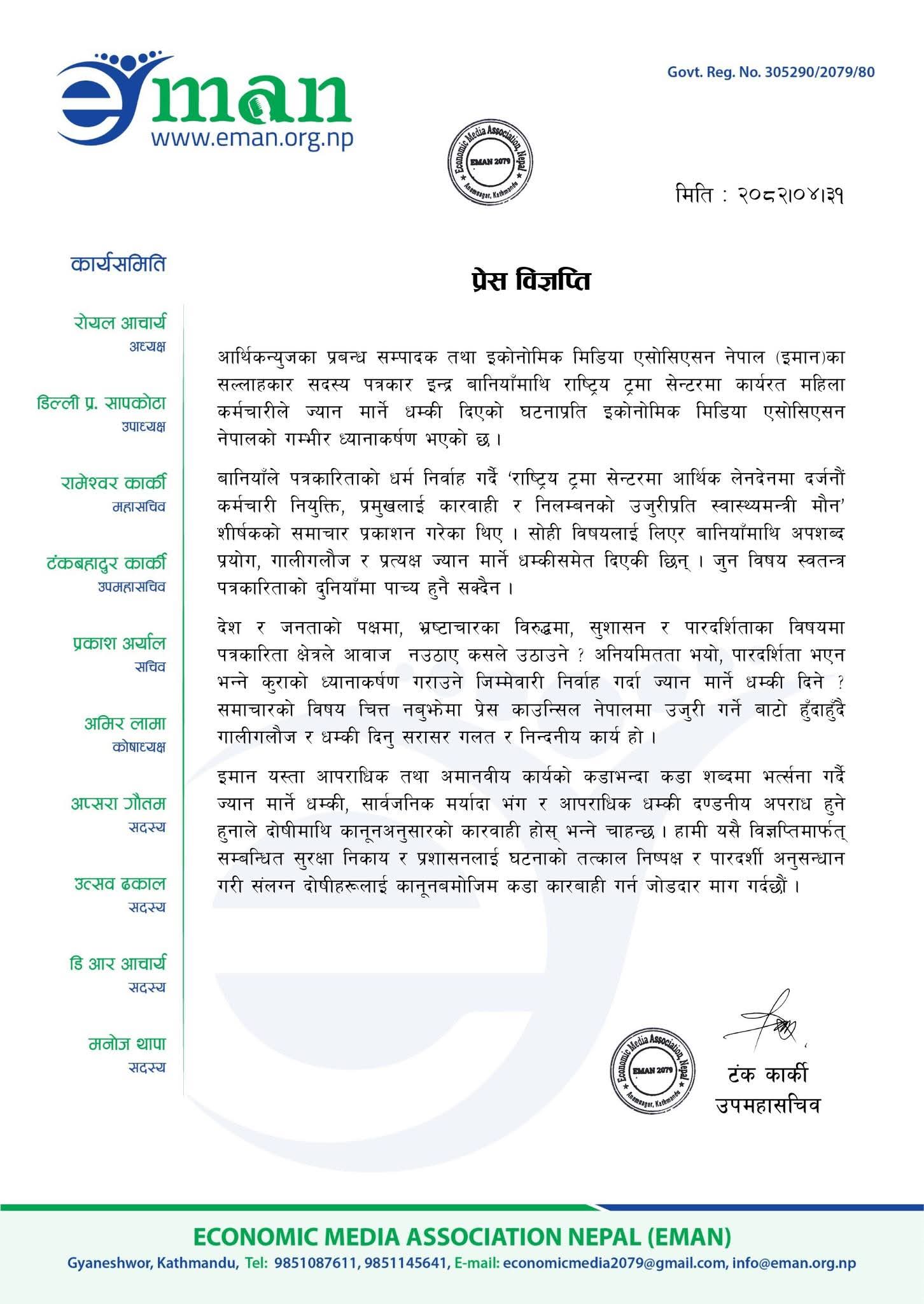 विज्ञप्तिमार्फत इमानले भनेको छ– “समाचारको विषय चित्त नबुझ्ने हो भने प्रेस काउन्सिल नेपालमा उजुरी दिने वैधानिक बाटो छ। तर पत्रकारमाथि गालीगलौज र धम्की दिनु आपराधिक र निन्दनीय कार्य हो।”