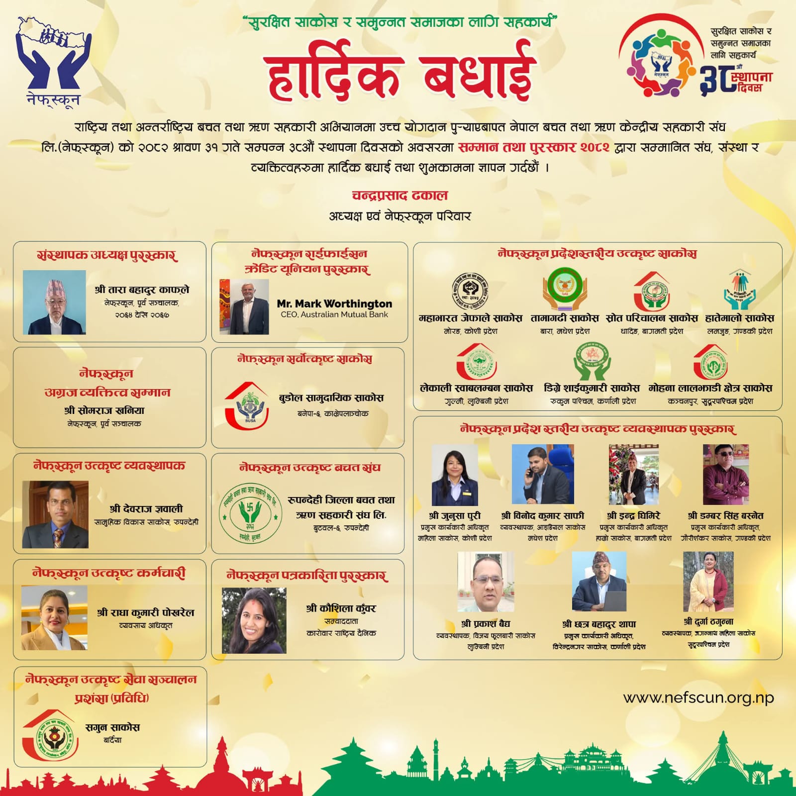 काठमाडौं ।नेपाल बचत तथा ऋण केन्द्रीय सहकारी संघ (नेफ्स्कून) ले आफ्नो ३८औं स्थापना दिवसको अवसरमा विभिन्न विधामा पुरस्कार तथा सम्मान प्रदान गरेको छ। शनिबार काठमाडौंमा आयोजित कार्यक्रममा संघका अध्यक्ष चन्द्र प्रसाद ढकालको अध्यक्षता तथा भूमि व्यवस्था, सहकारी तथा गरिबी निवारण मन्त्री बलराम अधिकारीको प्रमुख आतिथ्यतामा उत्कृष्ट व्यक्तित्व र सहकारी संस्थालाई सम्मान गरिएको हो।प्रमुख पुरस्कार तथा सम्मान
