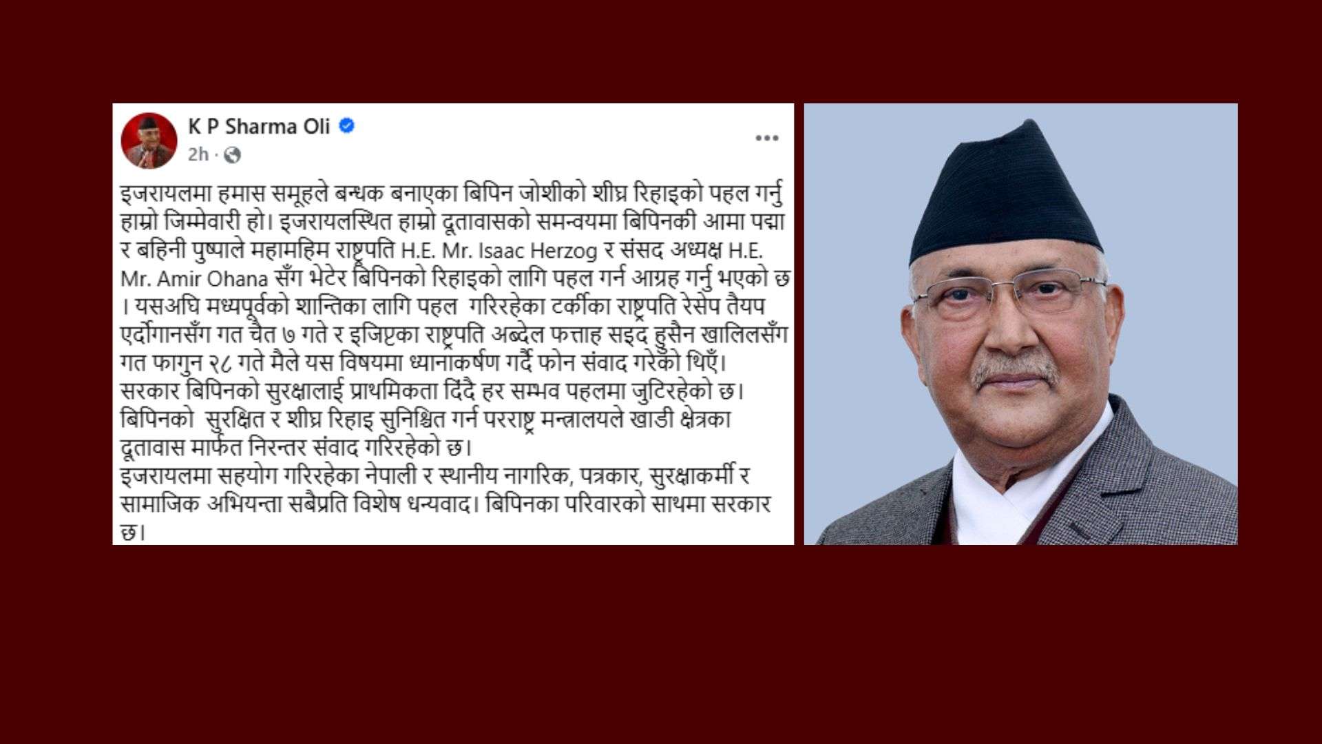‘इजरायलमा हमास समूहले बन्धक बनाएका बिपिन जोशीको शीघ्र रिहाइको पहल गर्नु हाम्रो जिम्मेवारी हो । इजरायलस्थित हाम्रो दूतावासको समन्वयमा बिपिनकी आमा पद्मा र बहिनी पुष्पाले महामहिम राष्ट्रपति H=E= Mr= Isaac Herzog र संसद अध्यक्ष H=E= Mr= Amir इजबलब सँग भेटेर बिपिनको रिहाइको लागि पहल गर्न आग्रह गर्नु भएको छ । यसअघि मध्यपूर्वको शान्तिका लागि पहल गरिरहेका टर्कीका राष्ट्रपति रेसेप तैयप एर्दोगानसँग गत चैत ७ गते र इजिप्टका राष्ट्रपति अब्देल फत्ताह सइद हुुसैन खालिलसँग गत फागुन २८ गते मैले यस विषयमा ध्यानाकर्षण गर्दै फोन संवाद गरेको थिएँ। सरकार बिपिनको सुरक्षालाई प्राथमिकता दिंदै हर सम्भव पहलमा जुटिरहेको छ ।’ उनले सामाजिक सञ्जालमा लेखेमा छन् ।