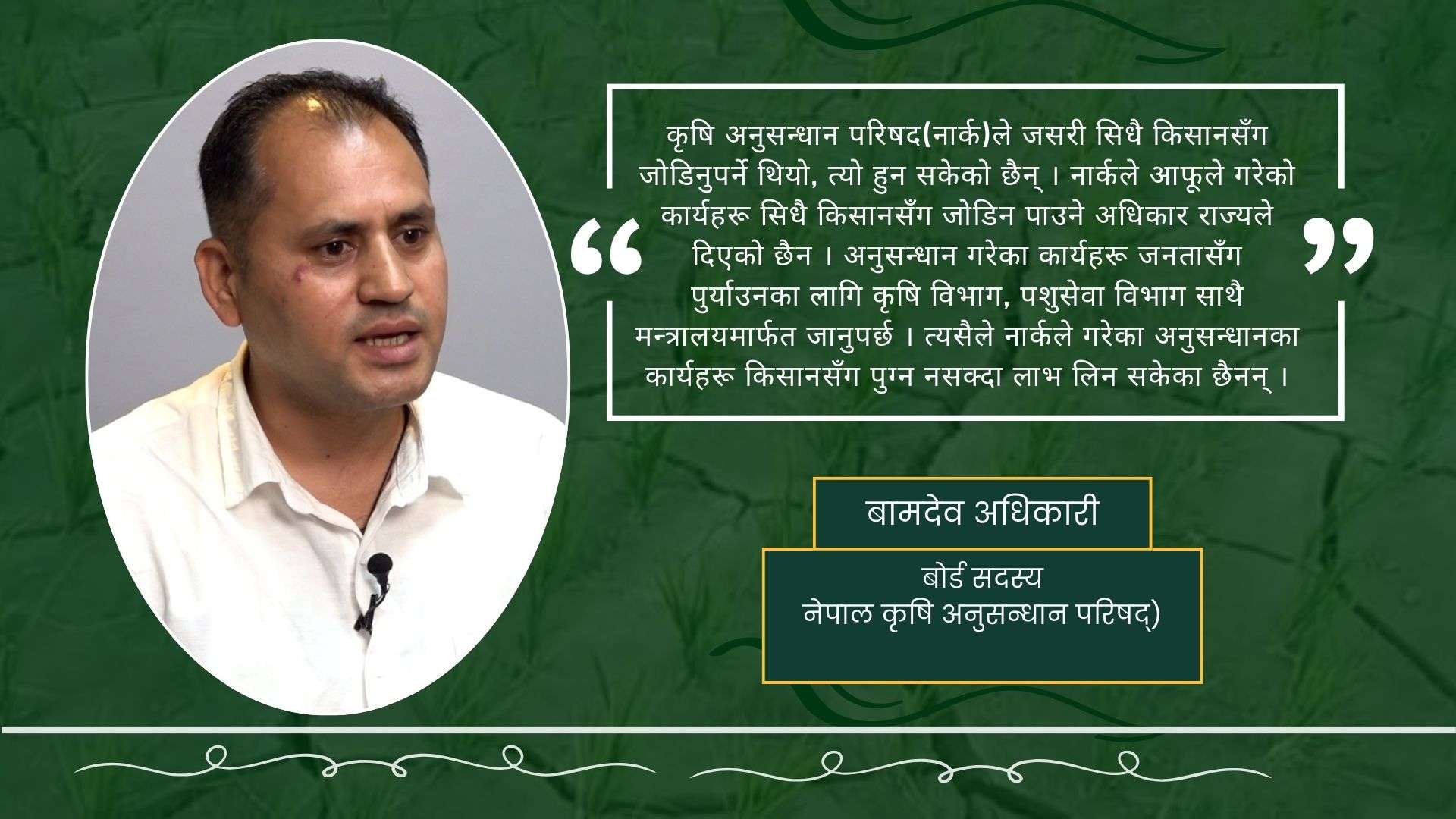 ‘यद्यपी, कृषि अनुसन्धान परिषदले जसरी सिधै जनतासँग जोडिनुपर्ने थियो, त्यो चाहिँ हुन सकेको छैन् । नार्कले आफूले गरेको कार्यहरू सिधै जनतासँग जोडिन पाउने त्यो खालको अधिकार उसलाई राज्यले दिएको छैन,’ उनले भने । ‘उसले चाहिँ आफूले अनुसन्धान गरेका कार्यहरू जनतासँग पुर्याउनको लागि कृषि विभाग, पशुसेवा विभागलगायत मन्त्रालय अन्र्तगतका अनेक निकायहरु छन् । जसले गर्दा नार्कले गरेका अनुसन्धानका कार्यहरू जनतासँग पुग्न सकेको छैन र त्यसबाट जनताले लाभ लिन सकेका छैनन् । नार्क र जनताबिचमा ग्याप छ । त्यसैले, यदि नार्कलाई सिधै जनतासँग पुर्याउने हो भने अथवा किसान र कृषि अनुसन्धान परिषदबीच एउटा सिधा सम्पर्कको व्यवस्था गर्नको लागि केही नीतिहरू सरकारको तर्फबाट नार्कलाई सहज गराइयो भनेदेखि नार्कले गर्न खोजेको कार्यहरू सिधै जनतासँग जोडेर गर्न सक्छ ।’