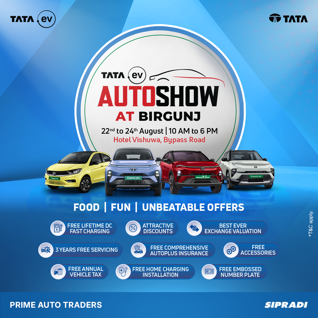 कार्यक्रम आयोजक प्राइम अटो ट्रेडर्स र सिप्रदी ट्रेडिङ का अनुसार, यो अटो शोले बिरगञ्ज र आसपासका ग्राहकहरूलाई विद्युतीय मोबिलिटीबारे प्रत्यक्ष अनुभव दिने र टाटा ईभी मोडलहरूबारे जानकारी लिन उत्कृष्ट अवसर प्रदान गर्ने जनाएको छ।
