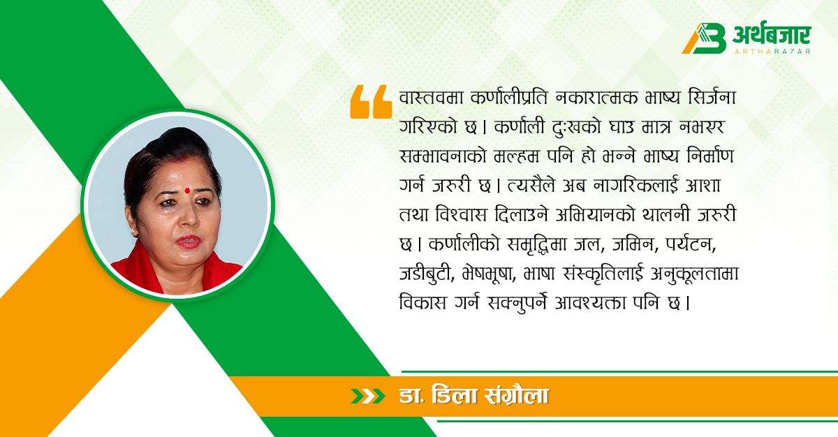 वास्तवमा कर्णालीप्रति नकारात्मक भाष्य सिर्जना गरिएको छ । कर्णाली दुःखको घाउ मात्र नभएर सम्भावनाको मल्हम पनि हो भन्ने भाष्य निर्माण गर्न जरुरी छ । त्यसैले अब नागरिकलाई आशा तथा विश्वास दिलाउने अभियानको थालनी जरुरी छ । कर्णालीको समृद्धिमा जल, जमिन, पर्यटन, जडीबुटी, भेषभूषा, भाषा संस्कृतिलाई अनुकूलतामा विकास गर्न सक्नुपर्ने आवश्यक्ता पनि छ । यो क्षेत्र विकासमा पछाडि पर्नुको कारण हिजोदेखिको उपेक्षासककगै कर्णालीवासीमा जागरुकताको कमी र उत्तरदायित्वबाट पन्छिनु प्रमुख कारण भएकाले यतातर्फ सोच्नुपर्ने अवस्था छ । त्यसैले कर्णालीप्रति हेय दृष्टिभावले हेर्ने नकारात्मक सूचक र मानसिकता अब बदल्न जरुरी छ ।