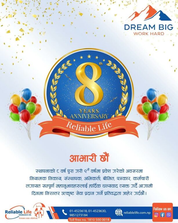 काठमाडौं। रिलायबल लाइफ इन्स्योरेन्स लिमिटेड ९औं वर्षमा प्रवेश गरेको छ।