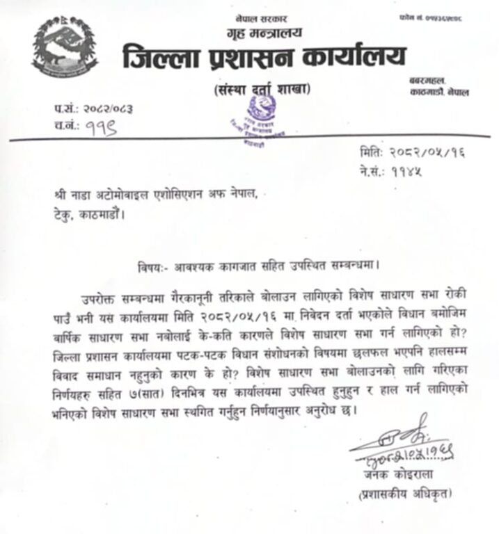 ‘गैरकानुनी तरिकाले बोलाउन लागिएको विषेश साधारण सभा रोकीपाउँ भनी यस कार्यालयमा भदौ १६ गते निवेदन दर्ता भएकोले विधान बमोजिम साधारण सभा नबोलाएर के कति कारणले विशेष साधारण सभा गर्न लागिएको हो ? जिल्ला प्रशासन कार्यालयमा पटक–पटक विधान संशोधनको विषयमा छलफल भएपनि हालसम्म विवाद समाधान नहुनुको कारण के हो,’ जिल्ला प्रशासनले जारी गरेको सुचनामा उल्ल्ेख गरिएको छ,‘ विशेष साधारणसभा बोलाउनको लागि गरिएका निर्णयहरु सहित ७ दिन भित्र जिल्ला प्रशासनमा उपस्थीत हुन र साधारण सभा स्थगीत गर्नुहुन अनुरोध छ ।’