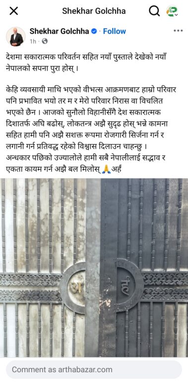 काठमाडौं । वरिष्ठ उद्यमी शेखर गोल्छाले केही व्यवसायीमाथि भएका आक्रमणले आफ्ना परिवारलाई असर पुर्याए पनि आफू र परिवार निराश नभएको बताएका छन्। शुक्रबार बिहान सामाजिक सञ्जालमार्फत प्रतिक्रिया दिँदै उनले देशमा सकारात्मक परिवर्तन आउन र नयाँ पुस्ताले देखेको “नयाँ नेपालको सपना” पुरा होस् भन्ने कामना व्यक्त गरेका छन्।
