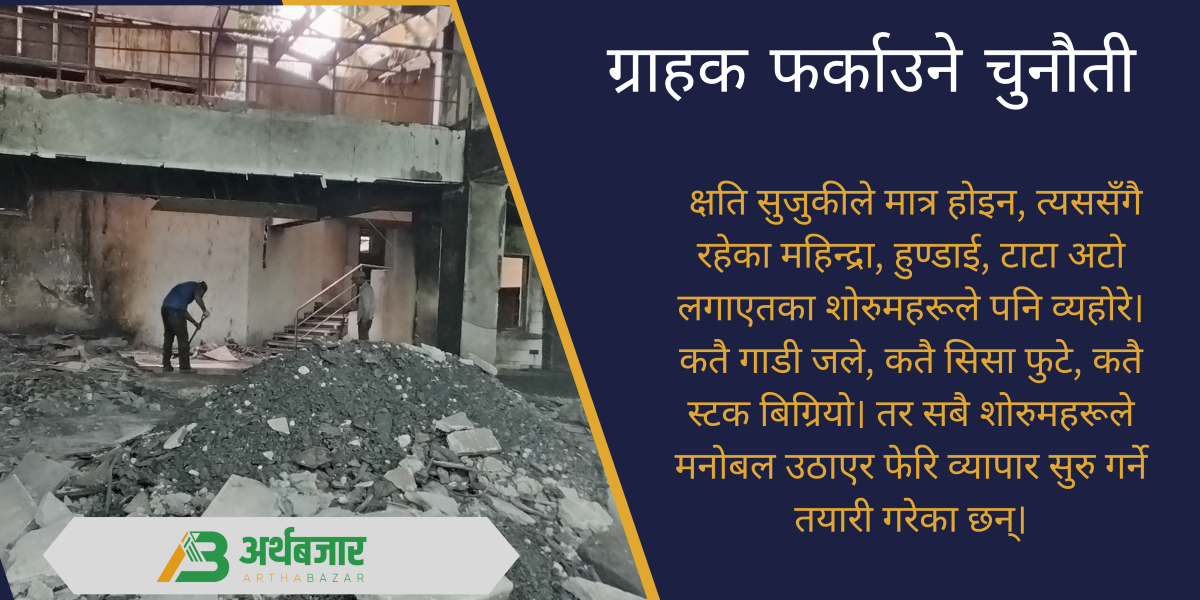 ‘दशैं नजिकिँदा हामीले फेरि शोरुम खुलाउने मनोबल बनाएका छौं। यो व्यापार सजिलै छाड्ने कुरा होइन। हाम्रा कर्मचारी, हाम्रा ग्राहक, सबैलाई फेरि विश्वास दिलाउनुपर्छ,’ शोरुमका एक प्रबन्धकले बताए।