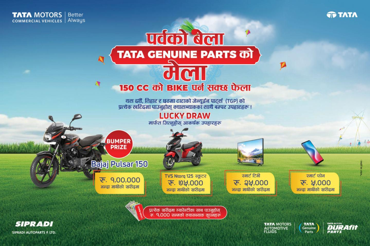 हालै देशमा आएको संवेदनशील परिस्थितिका कारण स्थगित गरिएको योजनालाई पुनः सुरु गर्दै कम्पनीले यसपालिको दशैँ, तिहार एवं छठ पर्वको अवसरमा “पर्वको बेला टाटा जेन्युइन पार्ट्सको मेला” नामक विशेष योजना ल्याएको हो।