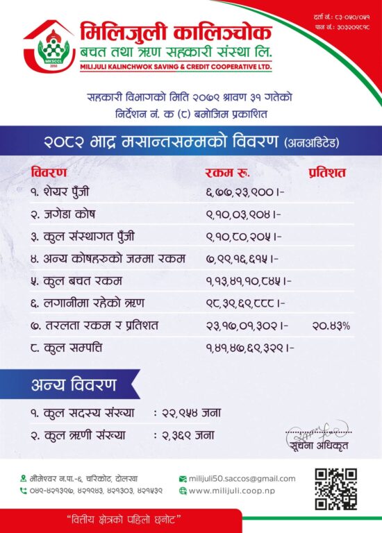 दोलखा — मिलिजुली कालिन्चोक बचत तथा ऋण सहकारी संस्था लिमिटेडले २०८२ साल भदौ मसान्तसम्मको अनअडिटेड आर्थिक विवरण सार्वजनिक गरेको छ। सार्वजनिक विवरण अनुसार संस्थाको कुल सम्पत्ति १ अर्ब ४१ करोड रुपैयाँ नाघेको छ, जुन निरन्तर बृद्धिको अवस्थामा रहेको छ । जसले संस्थाको वित्तीय अवस्था मजबुत रहेको संकेत गर्छ।