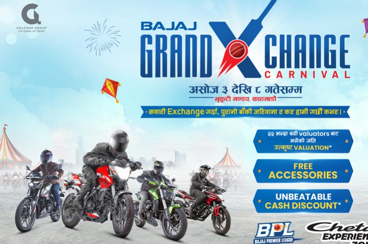 काठमाडौं । बजाज मोटरसाइकलका आधिकारिक वितरक हंशराज हुलास चन्द एण्ड कम्पनीले काठमाडौंको भृकुटिमण्डपमा ‘बजाज ग्राण्ड एक्सचेन्ज कार्निभल’ सुरु गरेको छ। असोज ३ गतेबाट सुरु भएको यो मेला असोज ८ गतेसम्म संचालन हुनेछ।