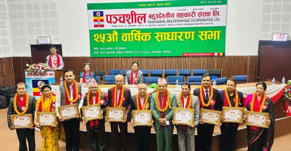 ललितपुर — कुमारीपाटीस्थित पञ्चशील बहुउद्देश्यीय सहकारी संस्था लिमिटेडको २५औं वार्षिक साधारण सभाले आगामी चार वर्षका लागि नयाँ सञ्चालक समिति चयन गरेको छ। सभाबाट देवेन्द्र प्रसाद श्रेष्ठ पुनः अध्यक्षमा निर्वाचित भएका छन्।