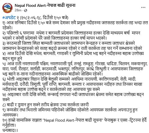 ६. भोलि आइतबार बिहानदेखि बेलुकीसम्मको अवधिमा नारायणी, कालीगण्डकी, सेती, मादी, मस्र्याङ्दी, दरौँदी, त्रिशूली, पूर्वी राप्ती, बागमती, कमला र आसपासका नदीहरू तथा तिनका शाखा नदीहरूमा बहाब उल्लेख बढ्ने र सतर्कताको तह आसपास पुग्न सक्ने ।