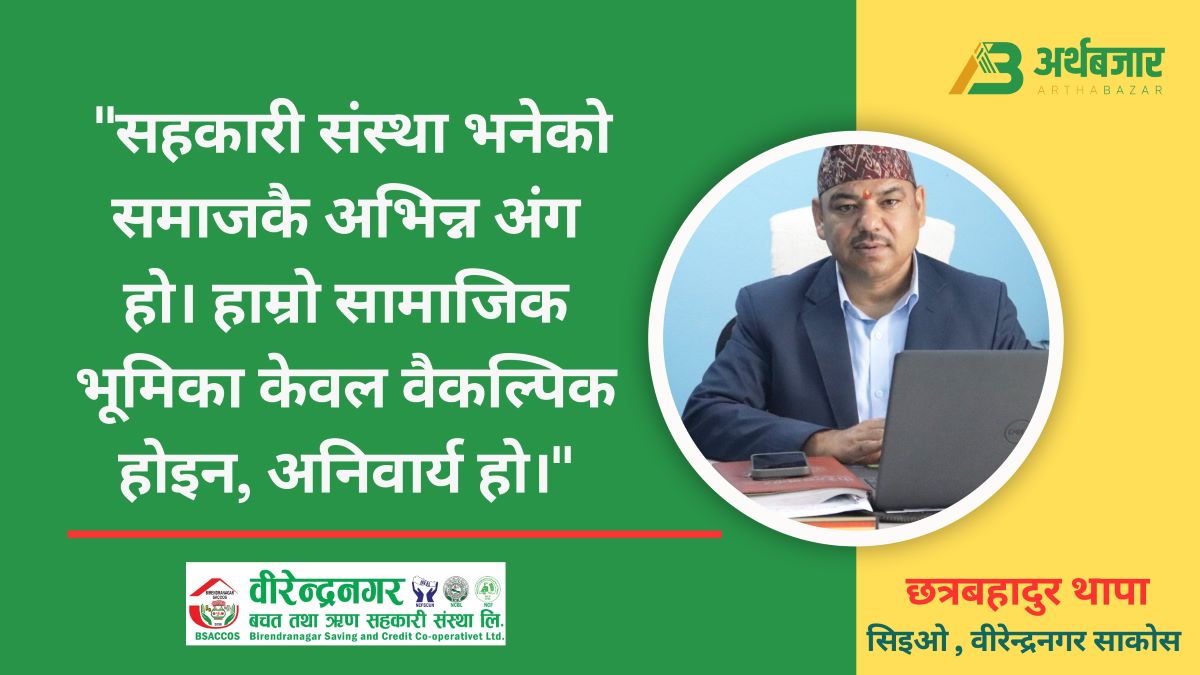 सामान्यतः बचत र ऋणलाई सहकारीको मुख्य आधार मानिन्छ, तर वीरेन्द्रनगर साकोसले त्यसलाई सामाजिक सेवाको दायरामा विस्तारित गरिसकेको छ।