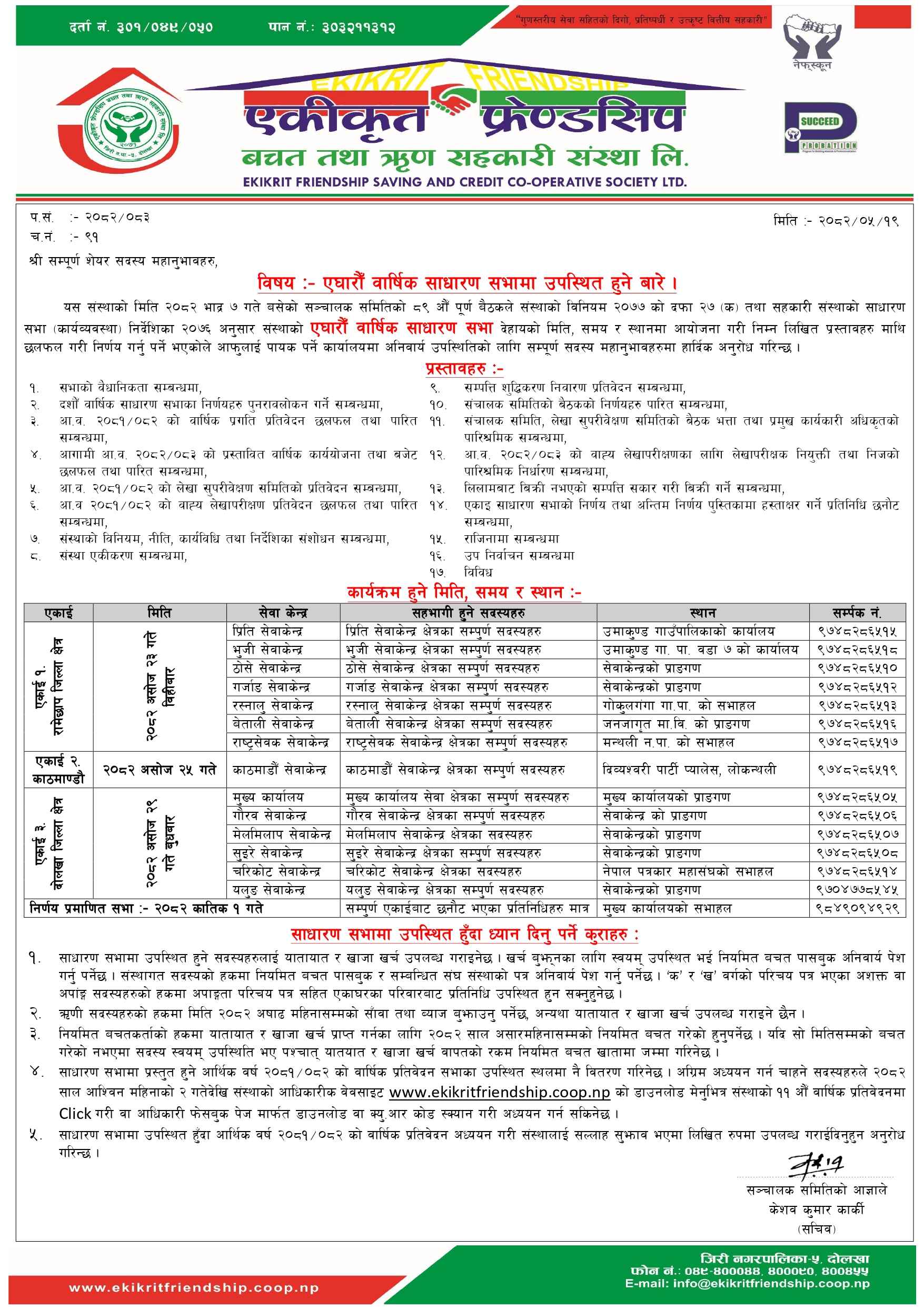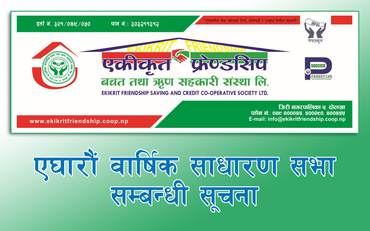 दोलखा — दोलखाको जिरीमा मुख्य कार्यालय रहेको एकीकृत फ्रेण्डसिप बचत तथा ऋण सहकारी संस्था लिमिटेडको एघारौं वार्षिक साधारणसभा आगामी अशोज २३ गतेबाट सुरु हुने भएको छ। सहकारीले सदस्यहरूको सहजता र सहभागिता सुनिश्चित गर्न क्षेत्रगत रूपमा साधारणसभा आयोजना गर्ने जनाएको छ।