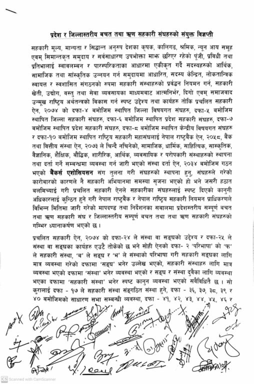 संघहरूले जारी विज्ञप्ति नेपाल राष्ट्रिय सहकारी नियमन प्राधिकरणका अध्यक्ष डा। खगराज शर्मालाई समेत बुझाएका छन्। विज्ञप्तिमा भनिएको छ, “सहकारी ऐन, २०७४ ले संघ तथा संस्थाहरूलाई दिएको स्पष्ट कानुनी अधिकारलाई नेपाल राष्ट्र बैंक र नियमन प्राधिकरणले हठात् जारी गरेका मापदण्ड तथा निर्देशनमार्फत सीमित र नियन्त्रणमा राख्ने प्रयास गरेको छ, जुन अस्वीकार्य छ।”