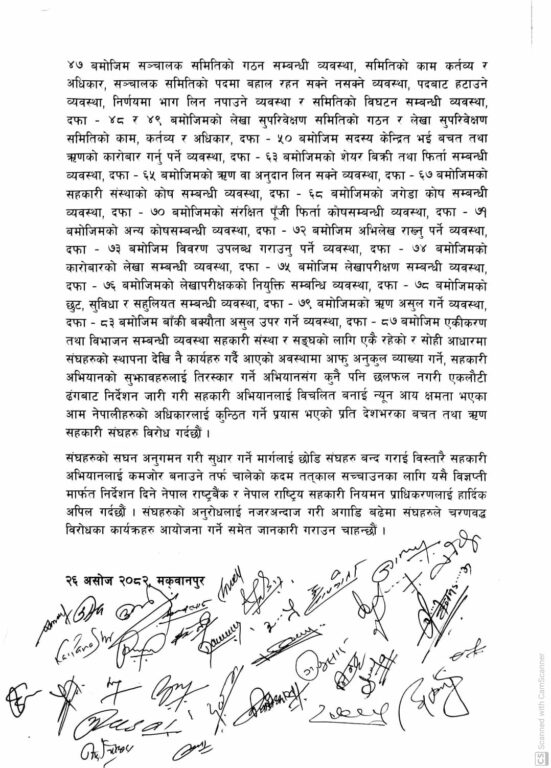 हेटौंडामा बसेको संयुक्त बैठकले सहकारी ऐन, २०७४ बमोजिम बचत तथा ऋणको कारोबार गर्न पाउने अधिकार सुनिश्चित गर्न माग गर्दै संयुक्त विज्ञप्ति जारी गरेको छ। विज्ञप्तिमा उक्त मापदण्ड र निर्देशनले सहकारी संघहरूको कानुनी अधिकार कुण्ठित गर्ने प्रयास भएको उल्लेख गरिएको छ।
