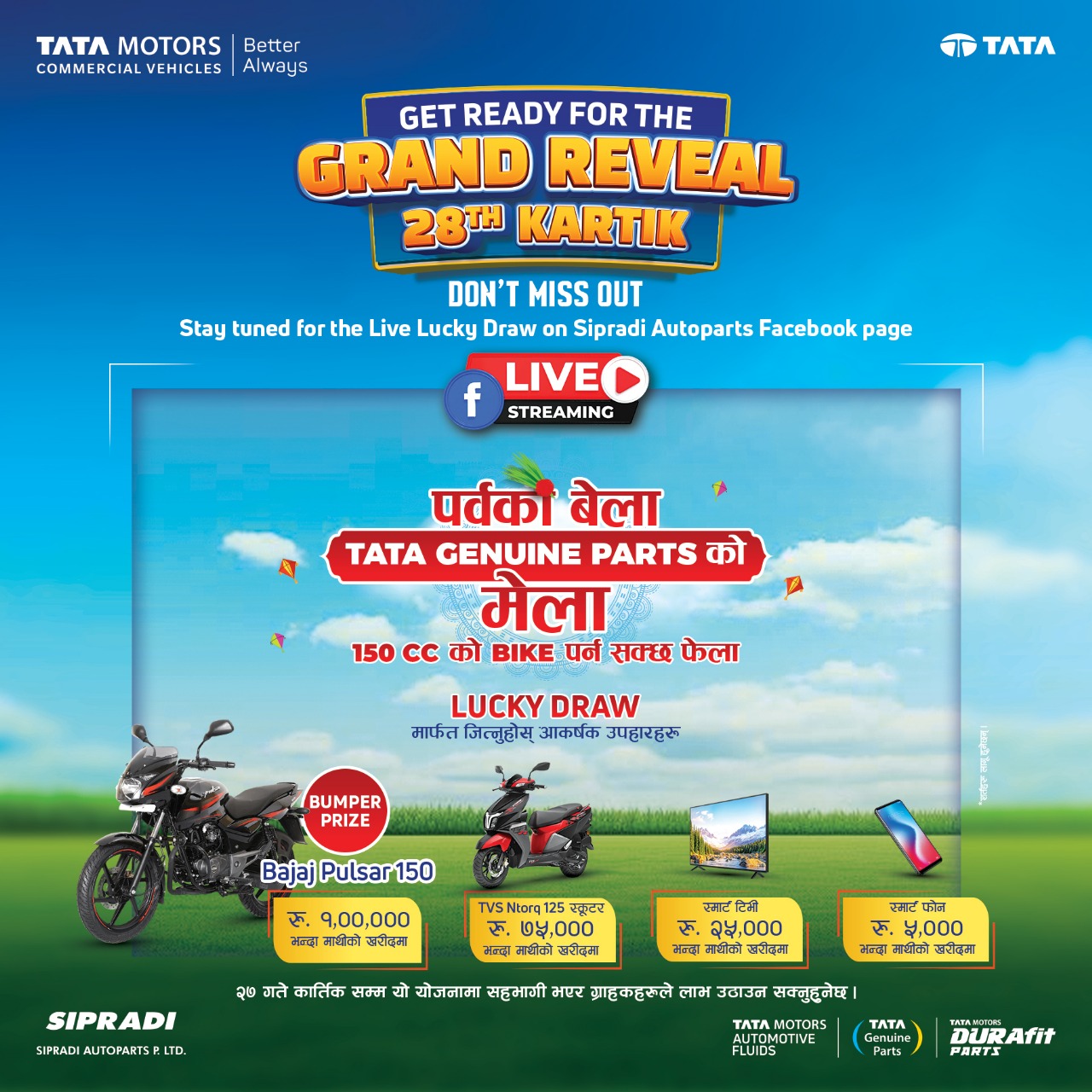 काठमाडाैँ । सिप्रदी अटोपार्ट्स प्रा.लि. द्वारा संचालित “पर्वको बेला टाटा जेन्युइन पार्ट्सको मेला” योजना अन्तर्गत अब ग्राहकहरूले कार्तिक २७ गते (नोभेम्बर 13) सम्म टाटा जेन्युइन पार्ट्स खरिद गरी लक्की ड्रमा सहभागी हुने तथा खरिदको समयमा नै रु. १,००० सम्मको क्यासब्याक कुपन प्राप्त गर्ने अवसर पाउने भएका छन्।