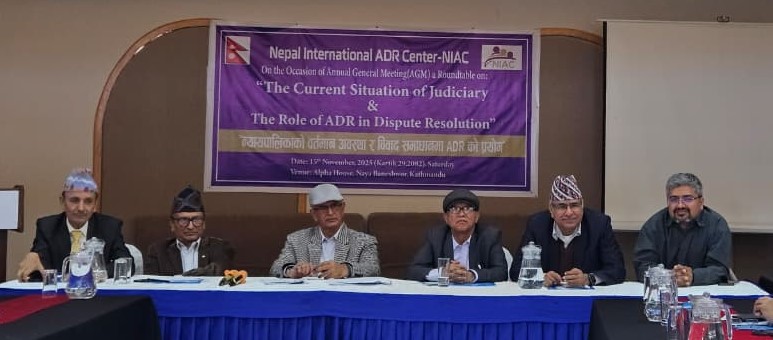 काठमाडौं । हालै न्यायालयमाथि भएको अभूतपूर्व भौतिक आक्रमणका कारण महत्वपूर्ण न्यायिक अभिलेख तथा मिसिल कागजात नष्ट भएको परिस्थितिमा वैकल्पिक विवाद समाधान (ADR) पद्धतिको प्रभावकारी प्रयोग अपरिहार्य रहेको धारणा सार्वजनिक भएको छ। यही विषयलाई केन्द्रमा राख्दै नेपाल इन्टरनेशनल एडिआर सेन्टर (NIAC) ले कार्तिक २९ गते वार्षिक साधारणसभाका अवसरमा “न्यायपालिकाको वर्तमान अवस्था र विवाद समाधानमा ADR को प्रयोग” शीर्षकमा एकदिने गोष्ठी सम्पन्न गरेको छ। गोष्ठीमा सर्वोच्च, उच्च अदालत, बार एशोसिएसन, कानुन व्यवसायी तथा सरोकारवाला विशेषज्ञहरूको उल्लेख्य उपस्थिति थियो।