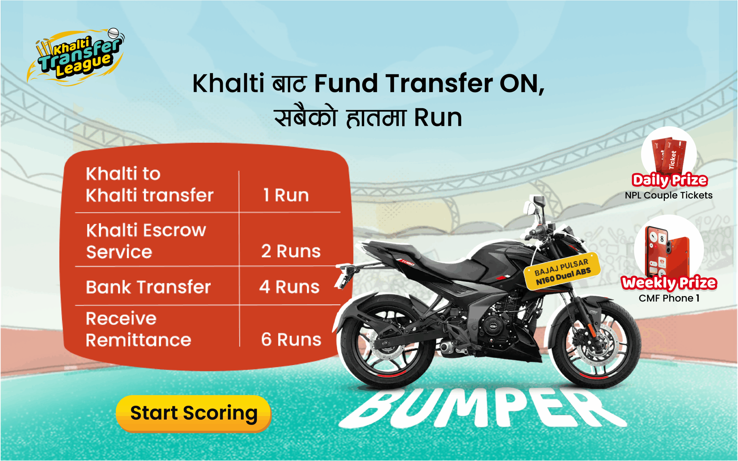 खल्तीबाट खल्तीमा ट्रान्स्फर गर्दा १ रन , खल्ती एस्क्रो प्रयोग गर्दा २ रन , खल्तीबाट बैंक खातामा ट्रान्स्फर गर्दा ४ रन , र विदेशबाट पठाएको रेमिट्यान्स प्राप्त गर्दा ६ रन बनाउन मिल्ने, र यि रनहरु जम्मा गरी ६ रनमा दैनिक ६ एनपिएल को टिकट , ५० रनमा हरेक हप्ता सि एम एफ फोन १ र १०० रनमा बम्पर पुरष्कार स्वरुप बजाजको पल्सर एन १६० डुअल एबिएस जित्ने मौका प्राप्त गर्न सकिन्छ ।