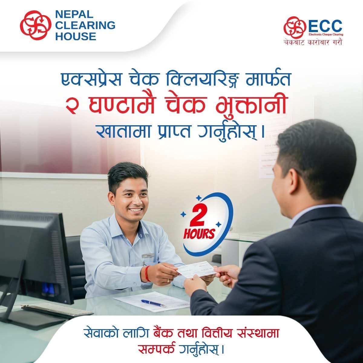 काठमाडौं। नेपाल क्लियरिङ हाउस (NCHL) ले एक्सप्रेस चेक क्लियरिङ सेवामार्फत अब २ घण्टाभित्रै चेक भुक्तानी खातामा जम्मा हुने सुविधा उपलब्ध गराएको छ। यस सेवाले बैंक तथा वित्तीय संस्थामार्फत चेक कारोबार गर्ने ग्राहकलाई छरितो, सहज र विश्वसनीय सेवा प्रदान गर्ने अपेक्षा गरिएको छ।