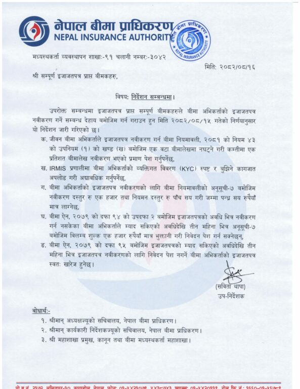 प्राधिकरणले सबै इजाजतपत्र प्राप्त बीमकहरूका नाममा परिपत्र जारी गर्दै अभिकर्ता इजाजतपत्र नवीकरणका प्रक्रिया तथा आवश्यकतामा एकरूपता कायम गर्न ५ बुँदे निर्देशन अनिवार्य रूपमा लागू गर्न निर्देशन दिएको हो।