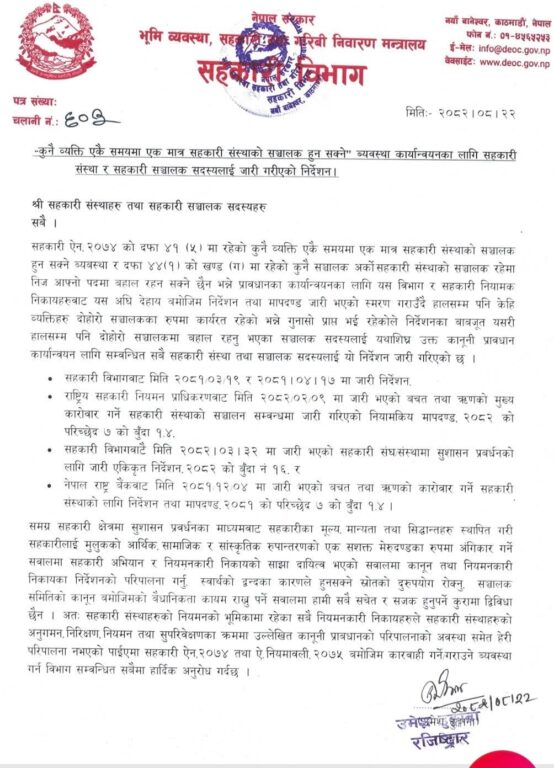 विभागले हालसम्म जारी भएका सबै कानुनी आधारहरूको उल्लेख गर्दै सहकारीहरूलाई तुरुन्तै सञ्चालकरसल्लाहकार सूची अद्यावधिक गर्न आग्रह गरेको छ। अनुगमनका क्रममा दोहोरो पद देखिएमा सहकारी ऐन र नियमावली अनुसार कारबाही गरिने चेतावनी पनि दिइएको छ।