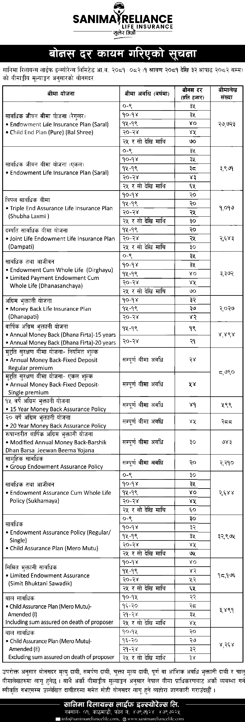 सामूहिक सावधिक बीमामा सबै बीमा अवधिका लागि २० रुपैयाँ बोनस कायम गरिएको छ। अन्य योजनामा पनि अवधि र योजना अनुसार ३० देखि ७५ रुपैयाँसम्मको बोनस दर निर्धारण गरिएको कम्पनीले जनाएको छ। बाल सावधिकका दुई छुट्टाछुट्टै योजनामा क्रमशः २२–४५ रुपैयाँ र २०–३४ रुपैयाँको बोनस दिइनेछ।