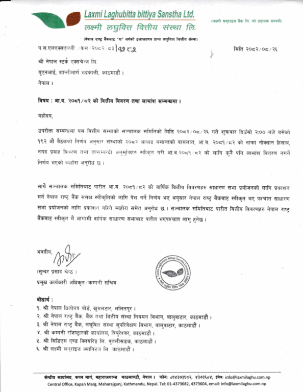 काठमाडौं । लक्ष्मी लघुवित्त वित्तीय संस्था लिमिटेडको मंसिर २६ गते बसेको सञ्चालक समितिको बैठकले लाभांश नदिने निर्णय गरेको छ।